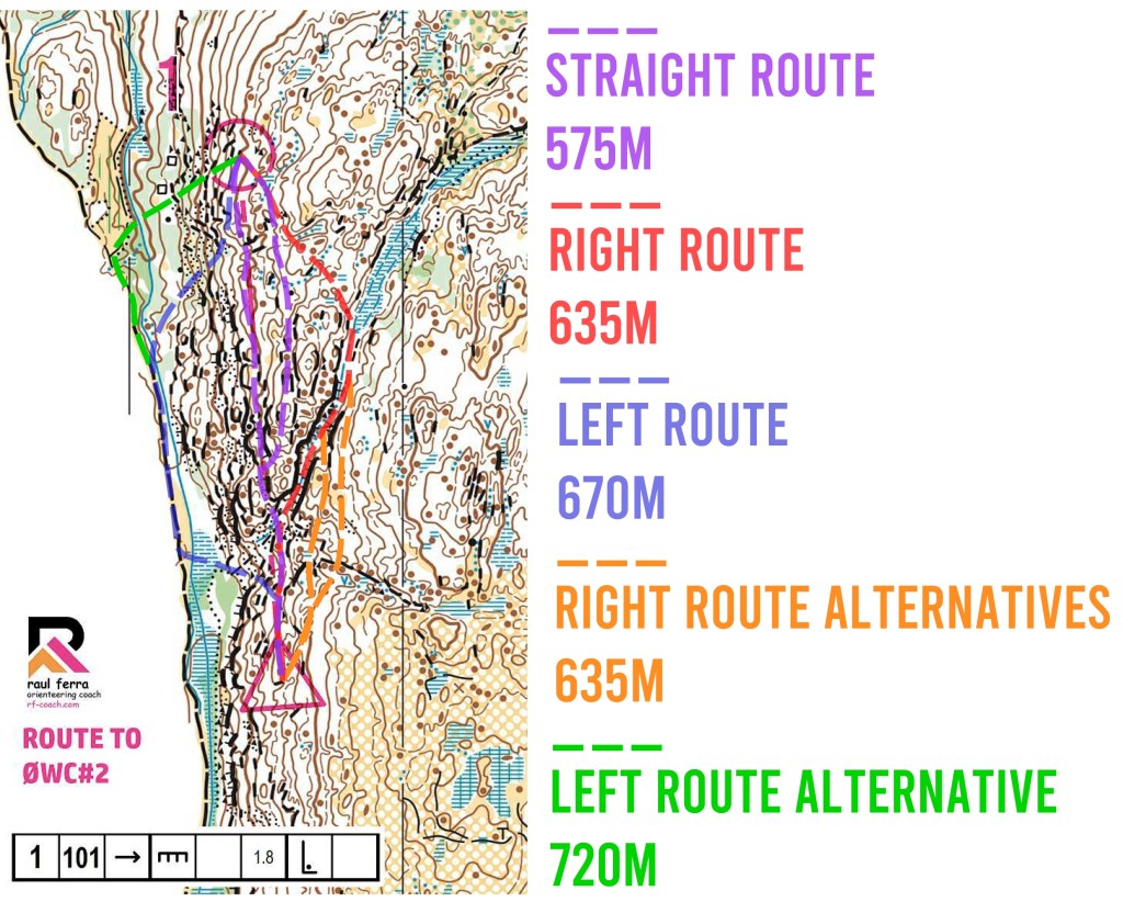 - Right route (635m): Choosing the route on the right (in any of its 3 initial variants), will mean an extra 70 meters in order to use areas with better runnability and visibility, assuming less risk. Those 70 meters represent little more than 10% extra compared to the straight route. It seems like a safer option than the straight option, and even if it could be slightly slower (assuming the straight option is executed perfectly without getting into trouble), the runner wouldn’t drop too many seconds here.