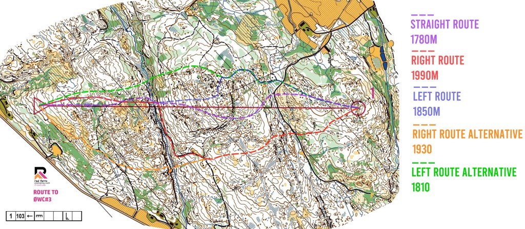 - Left route alternative (1810m): This option is a variant of the left route where we run from the beginning furthest from the red line to converge on the midsection of the leg. There seems to be no reason to consider it as a better option.