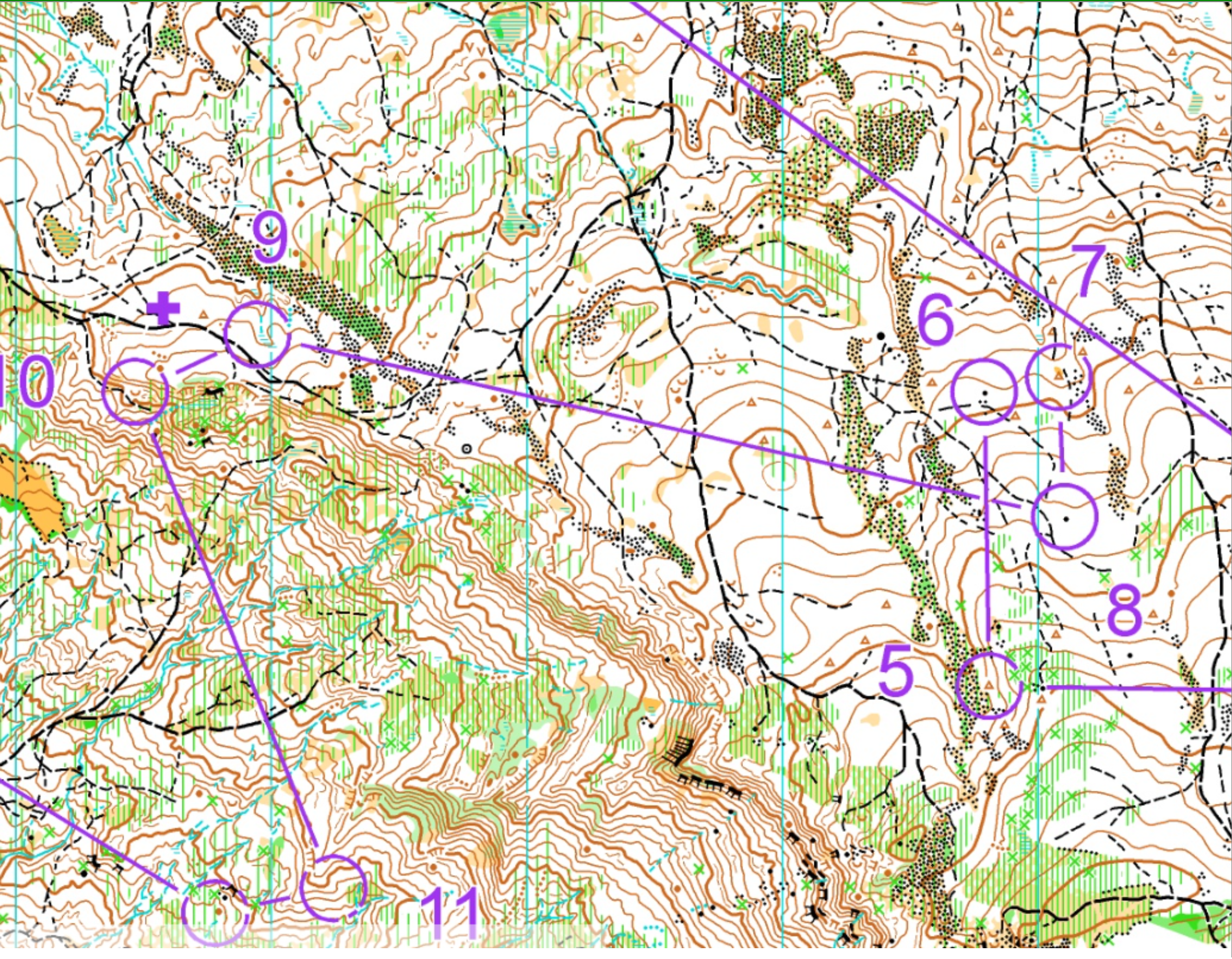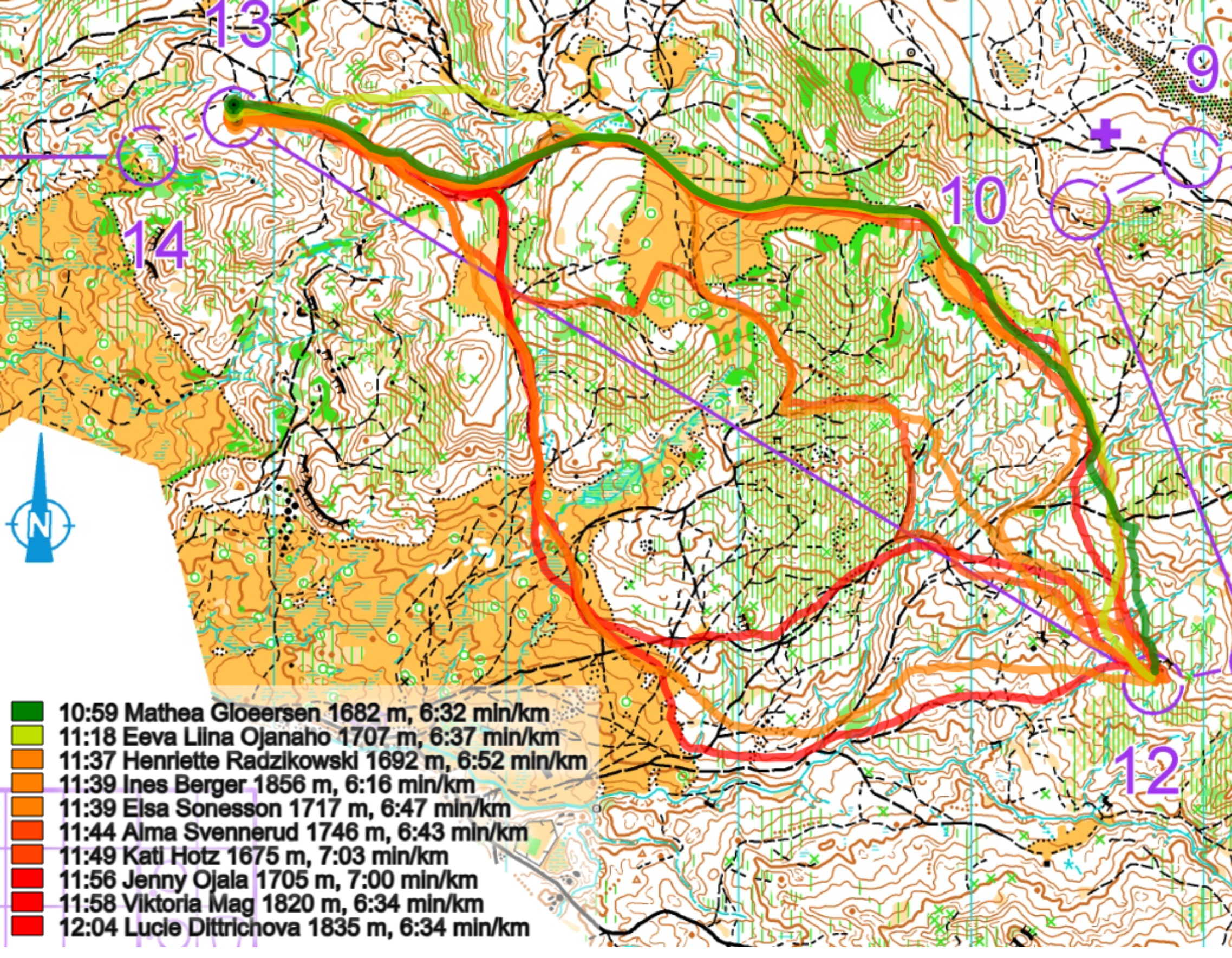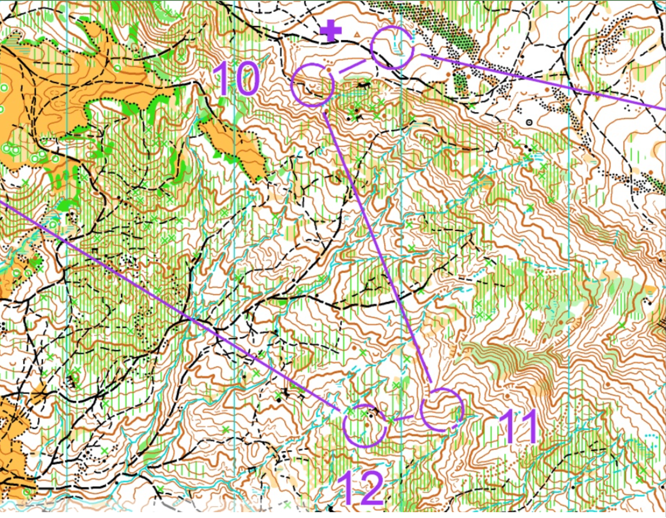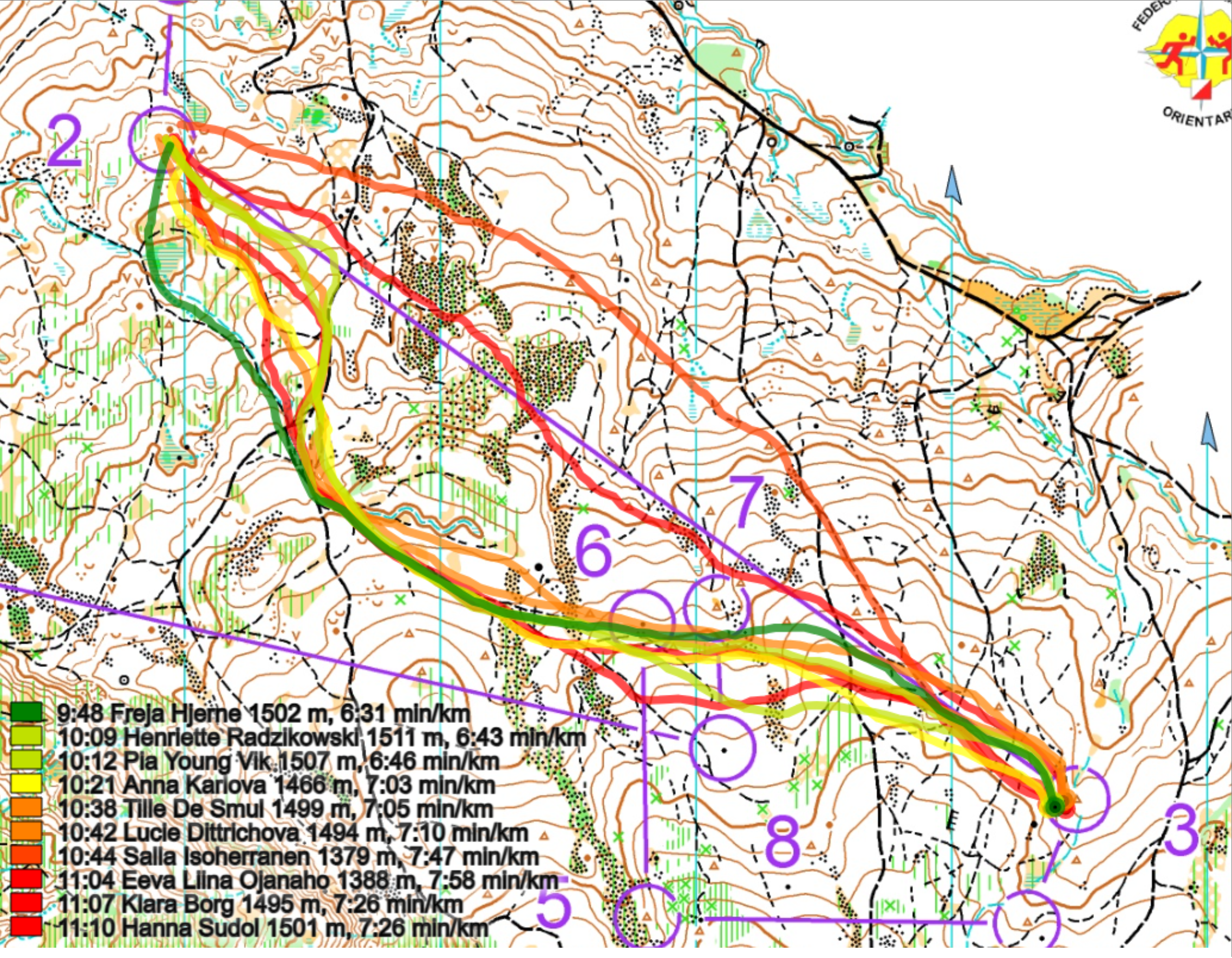 And finally, we come to the best leg of the day in terms of route choice. It is a very long leg with very different options in which, once the plan has been chosen, it is really important to push as much as possible on the path sections to scratch as much time as possible thanks to speed. Faced with a leg of this type, it is evident that trying to execute it directly, through the dense and steep slope, is not the best idea since it would be really slow. Therefore, it is necessary to analyze it with a wider vision. In this way, two alternatives appear (with many other “sub route choices”) that consist of 1) going up north to use the network of paths that lead to the control area 7-8; and 2) going down towards the West also using the network of roads to the meadow and, from there, go up to the control. Both options are interesting, although the northern option (1) was the fastest. In any case, as we mentioned earlier, it is very important to push hard and offensively in any of the options chosen, since speed is decisive for success in the leg.