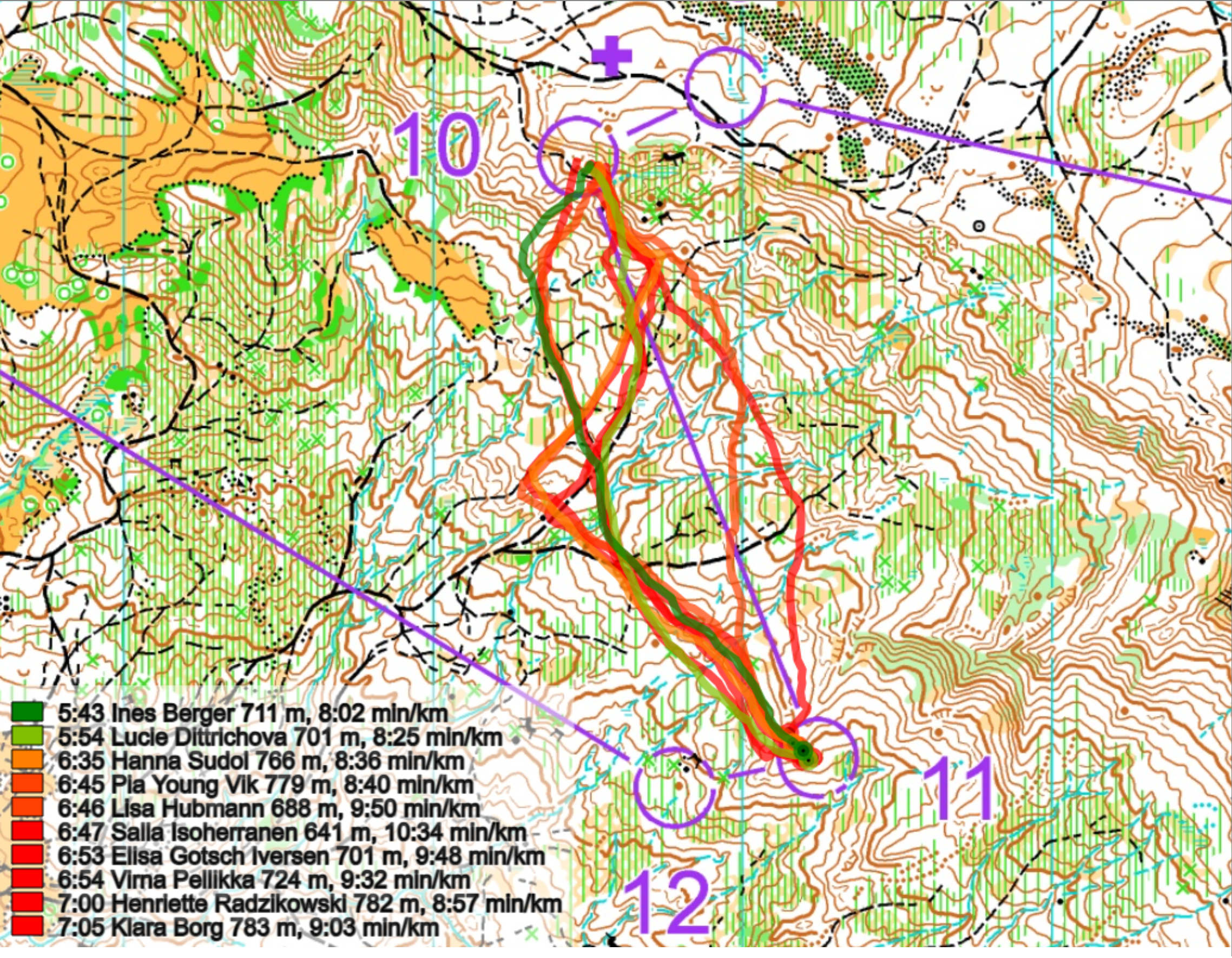 In this leg, we finally go to the south side of the slope, where the terrain is steeper, and the forest is denser and rougher. It is a diagonal downhill leg with an 80-meter difference in level. In this type of leg, it is important to get a clean attack on control to minimize losses. Therefore, it is a good idea to use the small paths to go down safely and look for an entrance to the control “at level” from a safe element. Perfect execution by Inés Berger in this leg. It is a leg where you are not going to win the race, but where you can easily lose it if you are not precise and focused enough!