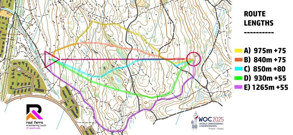 āļø Men: Option C looks like the overall best. It offers a good balance between directness and control, and allows decent running speed without taking too much risk. Option B is slightly shorter and could also be fast, but only if the forest is clean and youāre physically ready for a tough uphill. Option E (around) is surprisingly competitive: even though itās much longer, the wide track and minimal climb might compensateāespecially for those who can maintain high speed. Options A and D are less attractive: A is simply too long for what it offers, and D is technically risky without much gain.