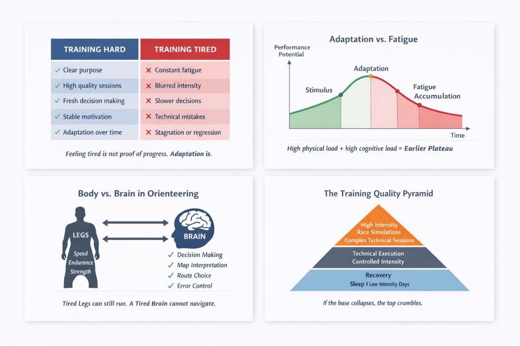 Especially in orienteering, stacking hard physical sessions with demanding technical work day after day overloads the system quickly. The brain also needs recovery, even if the legs feel capable. - Do not rely on tapering to fix months of overload.