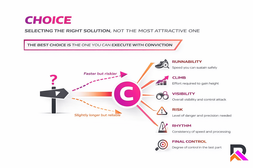 Good judgment in Choice comes from evaluating more than distance. The athlete must consider runnability, climb, visibility, rhythm, risk, entry quality, and how well the option fits his own strengths in that moment.