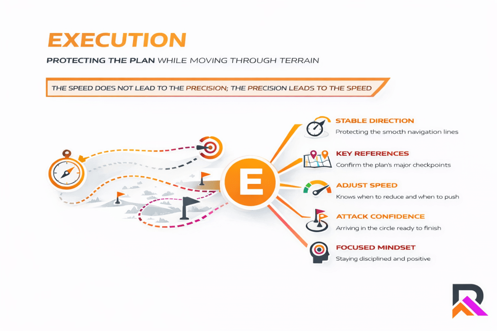 Good execution means staying connected to both the plan and the map. It means protecting direction, checking the key references, adjusting speed to complexity, and arriving in the circle with enough control to finish cleanly. In other words, Execution is not just running the route. It is continuously keeping the route alive.