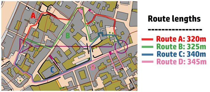 Routes C and D are around 20 to 25 metres longer, but they offer a cleaner structure. There are fewer turning points, smoother running, and better opportunities to anticipate the next section. Over this distance, 25 extra metres is roughly 5 seconds at 3:30/km, so the key question is simple: do the shorter routes really save those seconds once braking and hesitation are taken into account?